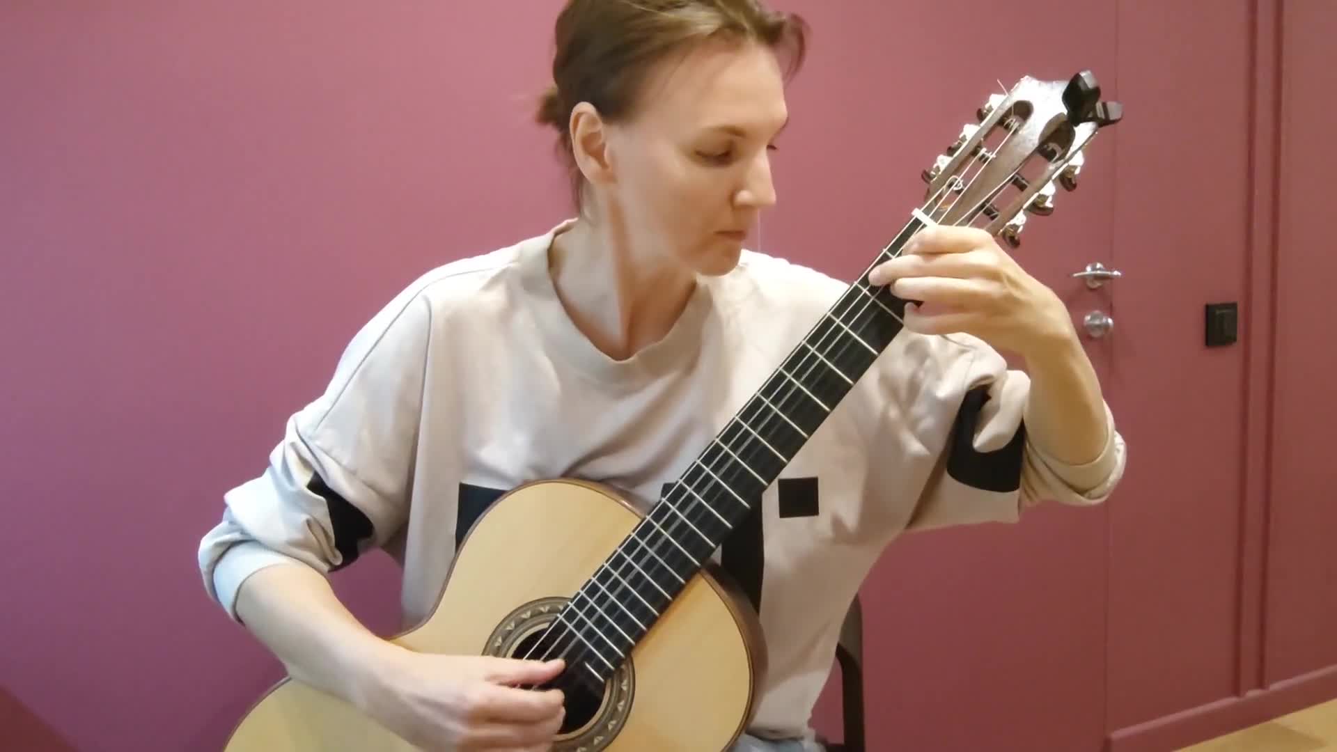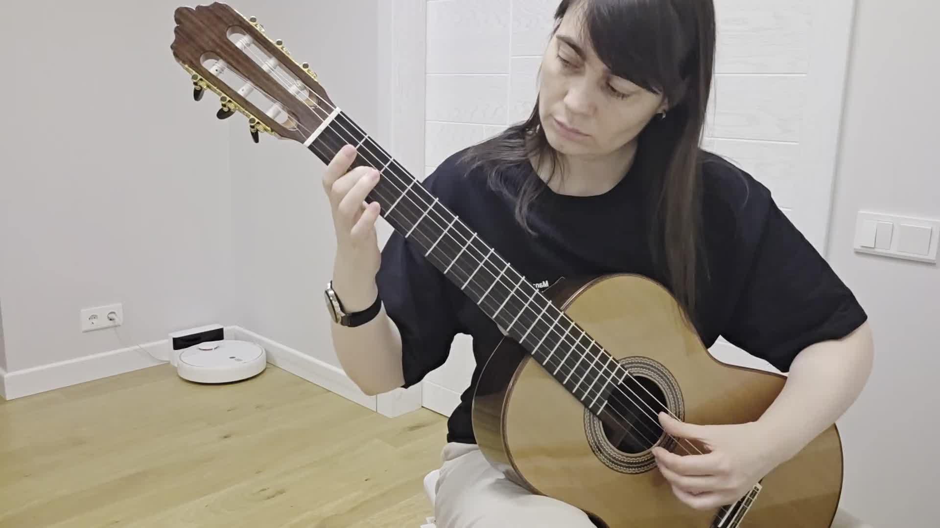 Изначально играла на электрогитаре, но также захотела освоить классическую и акустическую гитару, где совсем другая техника и специфика звукоизвлечения. Работаем над классической постановкой, но до конца ещё не удалось поставить правую руку, на видео ещё заметен небольшой разворот ладони наружу, свойственный медиаторной технике. Будем продолжать работать.